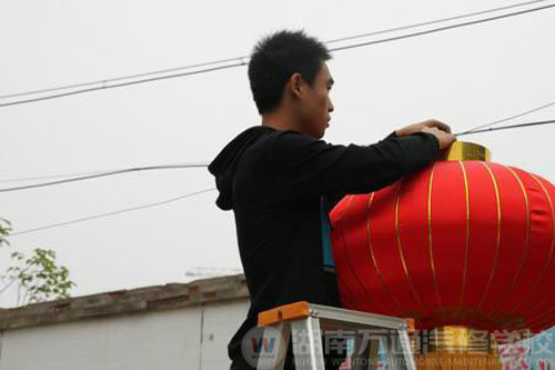 除了國慶晚會節(jié)目的緊張籌備外學校工作工作人員還協(xié)同學生一起在咨詢中心以及主干道兩旁掛起燈籠,大紅的燈籠在翠綠間點綴得異常的耀眼,在一些樹干上,學生們還別出新意的掛起了一連串的小燈籠,另外,墻上、半空中,還分別用巨大的噴繪以及五顏六色的彩旗做了節(jié)日的點綴,整個學校沉浸在一片喜慶的節(jié)日氛圍當中。