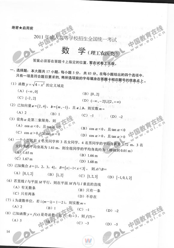 2011成人高考數(shù)學(xué)(理)試題及答案:高起點