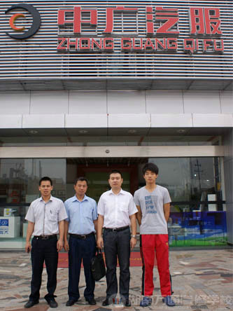 嘻游記汽車服務(wù)連鎖機(jī)構(gòu)門口,陸金勇等幾位畢業(yè)學(xué)子與公司老總和陸主管合影