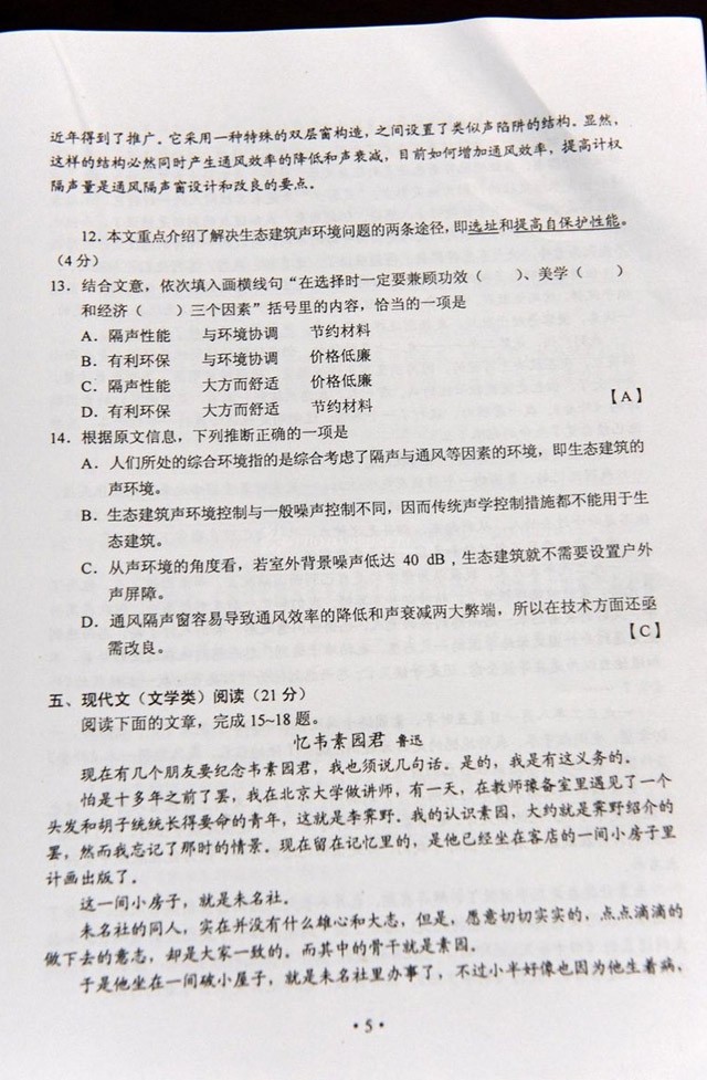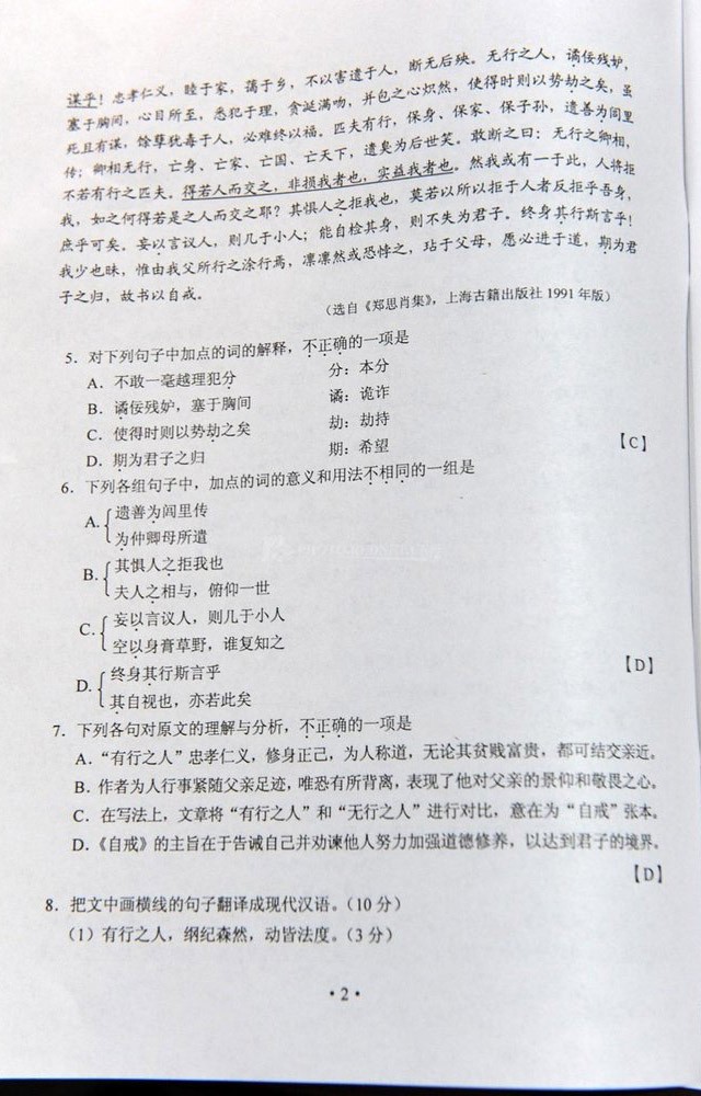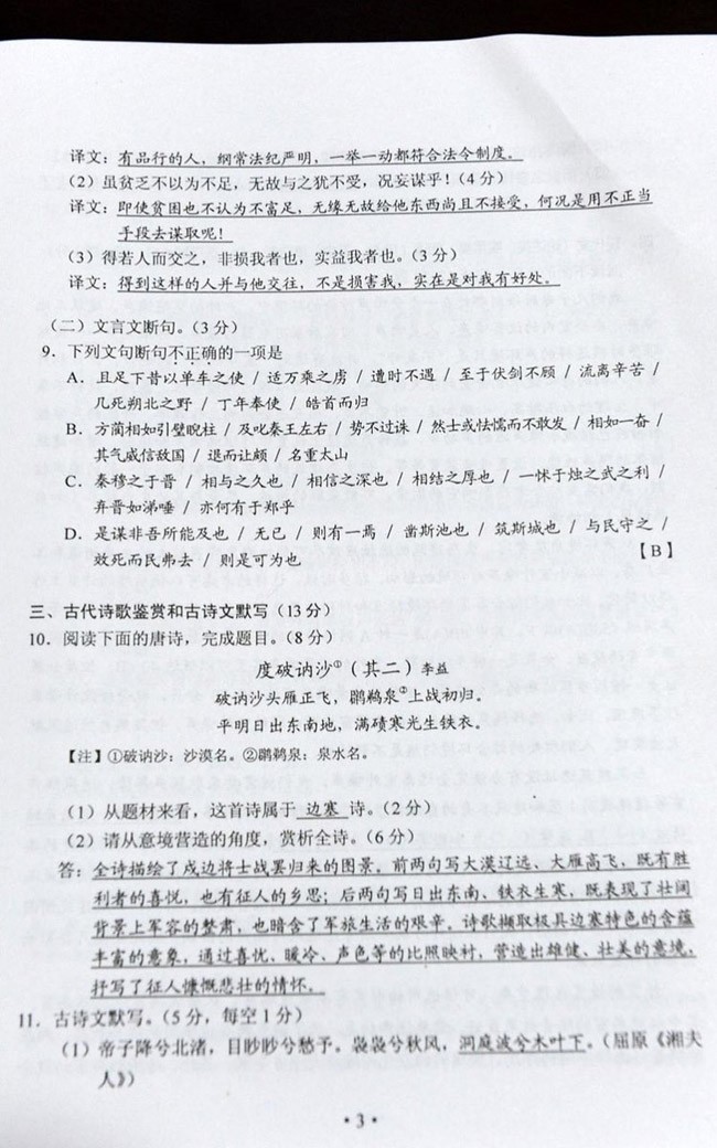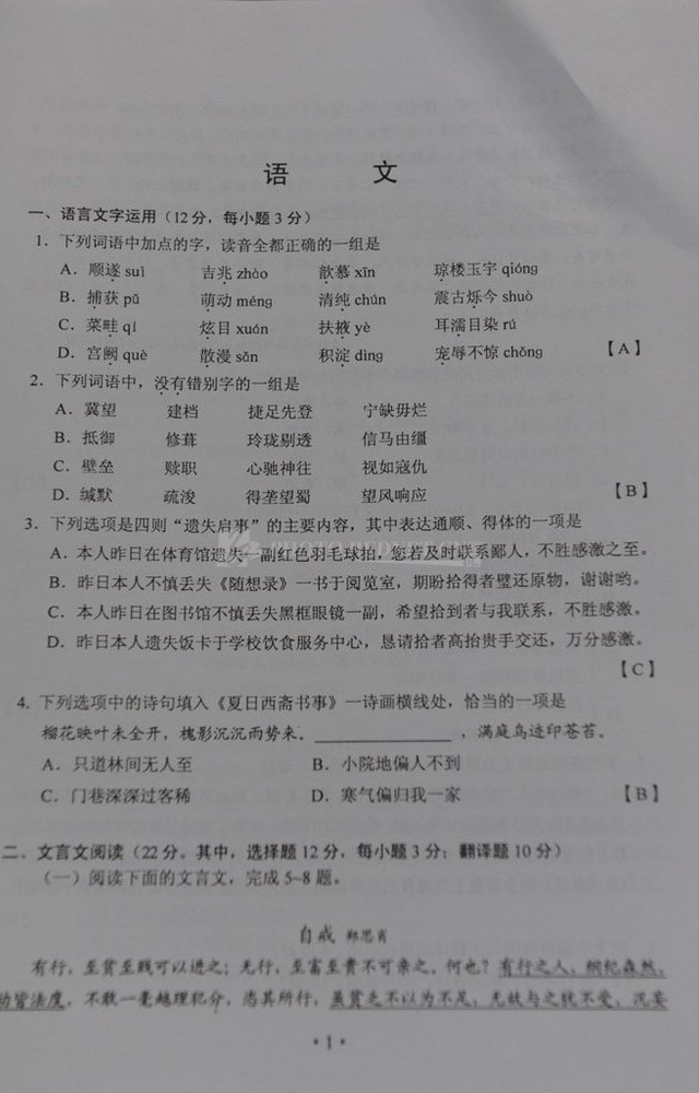 2012年湖南高考語文答案