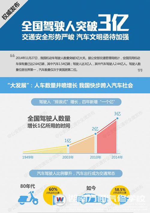 一、2014年11月27日,我國機動車駕駛?cè)藬?shù)量突破3億大關(guān)。據(jù)公安部交通管理局統(tǒng)計,全國民用機動車保有量已達2.64億輛,其中汽車1.54億輛;駕駛?cè)诉_3億人,其中汽車駕駛?cè)?.44億人。駕駛?cè)藬?shù)量位居世界第一,汽車數(shù)量僅次于美國居第二位??吹竭@組數(shù)據(jù),還在為學(xué)汽修專業(yè)好不好而煩惱的你,有主意了嗎?