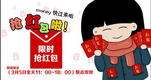 正月十五(3月5日)11:00-18:00,紅包每個(gè)整點(diǎn)發(fā)一次,共計(jì)8次哦。親,早來(lái)要等,過時(shí)不候,大獎(jiǎng)隨機(jī)出現(xiàn),機(jī)會(huì)多多,但也是需要搶的,為了避免健忘癥,現(xiàn)在就定個(gè)鬧鐘提醒吧!