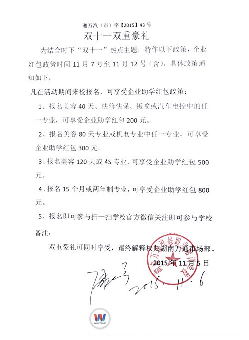 這次,為了響應(yīng)各大立志于汽修學(xué)子們的需求,湖南萬(wàn)通汽修學(xué)校值此“雙十一”之際,特此與各大知名企業(yè),開啟報(bào)名優(yōu)惠助學(xué)活動(dòng)!送霸道紅包各專業(yè)皆有份,在本次優(yōu)惠助學(xué)中,報(bào)讀不同熱門汽修專業(yè),皆可享受企業(yè)紅包政策。學(xué)好熱門的汽修技術(shù),得一技之長(zhǎng),無(wú)論是職場(chǎng)闖天下,還是走創(chuàng)業(yè)“瑯琊榜”,通通不是問題!具體助學(xué)優(yōu)惠政策如下: