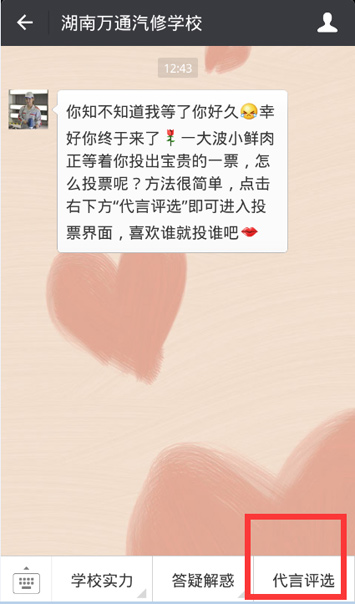 第三步:進(jìn)入微信對(duì)話框,點(diǎn)擊“代言評(píng)選”
