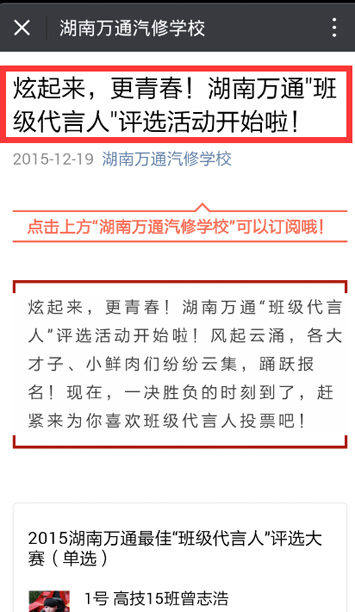 在此,小編代學(xué)校與參評(píng)的鮮肉們誠(chéng)懇致謝,因?yàn)橛心銈兊闹С?,我們才更為有?dòng)力與激情去投入“學(xué)與教”的這場(chǎng)汽修技能接力賽中,才會(huì)讓校園生活如此多姿多彩!而對(duì)于本次微信評(píng)選活動(dòng),很多親們也想帶來(lái)一份支持,可就是不知道步驟,現(xiàn)在小編在此詳細(xì)講解!