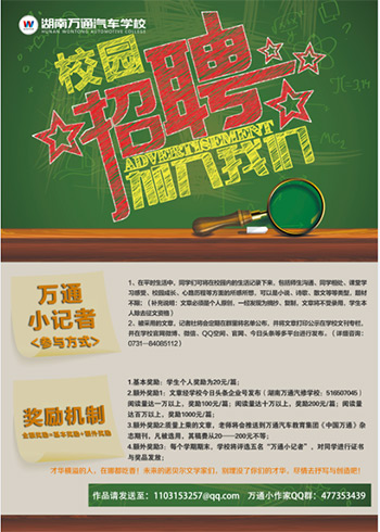 “盡情品味校園生活百態(tài),記錄青春點滴,讓進步與你隨行!”為了推動校園文化氣息,提高學生綜合能力,給萬通學子提供一個勤工儉學、展現(xiàn)自我的廣闊平臺,我校特此開展校園有獎征文活動。