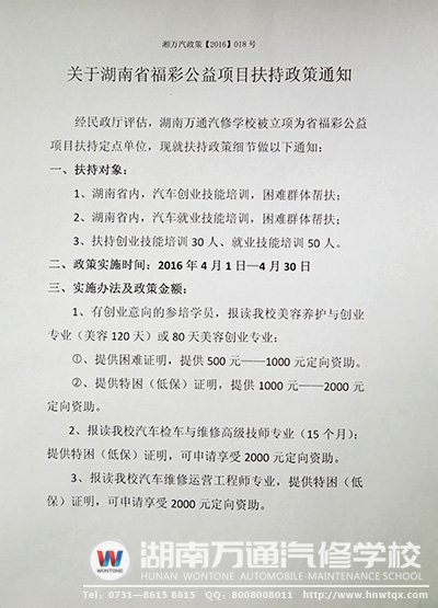 經(jīng)民政廳評(píng)估,湖南萬(wàn)通汽修學(xué)校被立項(xiàng)為省福彩公益項(xiàng)目扶持定點(diǎn)單位,現(xiàn)就扶持政策細(xì)節(jié)做以下通知: