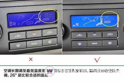 五、長期將空調(diào)溫度調(diào)到最低非常不好。即使酷暑難當(dāng),大家也最好不要將空調(diào)長期調(diào)至最低溫度,車內(nèi)外的巨大溫差容易引起感冒甚至空調(diào)病,如果是自動(dòng)恒溫空調(diào),26°是比較合適的溫度。