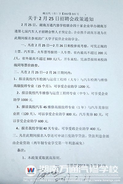 為了更好的做好春季畢業(yè)生的就業(yè)工作,更好的為企業(yè)挑選優(yōu)秀人才,增進(jìn)畢業(yè)生與用人單位的彼此了解,同時也為企業(yè)與學(xué)校、學(xué)生開展更廣泛的交流建立一個平臺,湖南萬通汽修學(xué)校將于2月25日聯(lián)合四十家企業(yè)舉辦2017年大型春季校園招聘會。企業(yè)攜手湖南為在此期間報名參觀的廣大學(xué)子提供企業(yè)助學(xué)金。