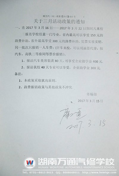 湖南萬通汽修培訓學校春季火熱報名還在持續(xù)中,學?,F(xiàn)更有3月助學政策驚喜來襲。想學汽車美容裝潢、想擁有一門高新技術(shù)、想創(chuàng)業(yè)的你絕對不要錯過哦!快人一步才能搶占先機,報名熱門汽修好專業(yè),準備迎接新的挑戰(zhàn)。行動改變命運,熱門專業(yè)名額有限,搶,才是機會!