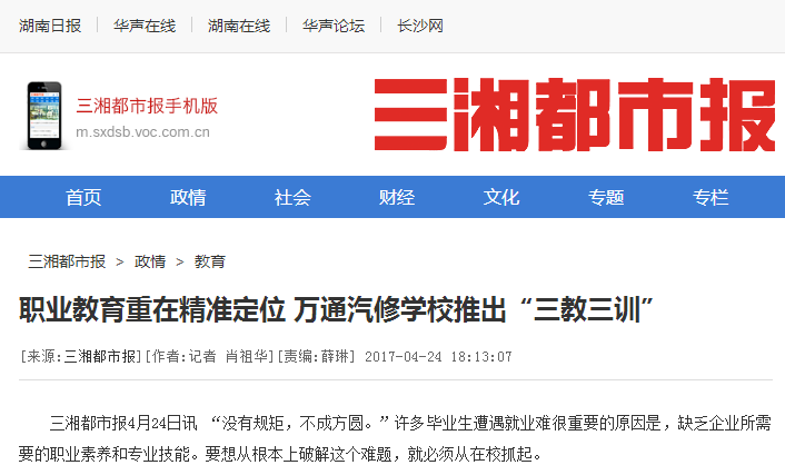 湖南萬通汽車學(xué)校結(jié)合企業(yè)管理方式,用職業(yè)規(guī)范學(xué)生,使職業(yè)成為習(xí)慣,使每一位學(xué)生在畢業(yè)后都能成為符合企業(yè)發(fā)展要求的“準職業(yè)人”。