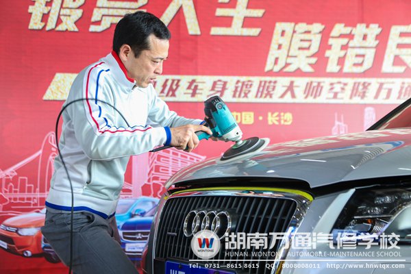 長尾先生首先是給大家簡單分享了他的成長故事,由此鼓勵同學(xué)們要堅持與細致,勤于動手,善于總結(jié)。緊接著,長尾先生來到了實訓(xùn)課堂,親自向同學(xué)們展示了他高超的手藝,一邊演示,一邊講解,細心地考量到學(xué)子們還只是初出茅廬,所以大師講得深入淺出,通俗易懂。只見大師將工具準備到位后,他仔細將車身清潔完畢,做好防護,將車身研磨拋光后,就開始鍍膜。同學(xué)們聚精會神,一分鐘都舍不得跑神,只怕錯過了任何一個小細節(jié)。