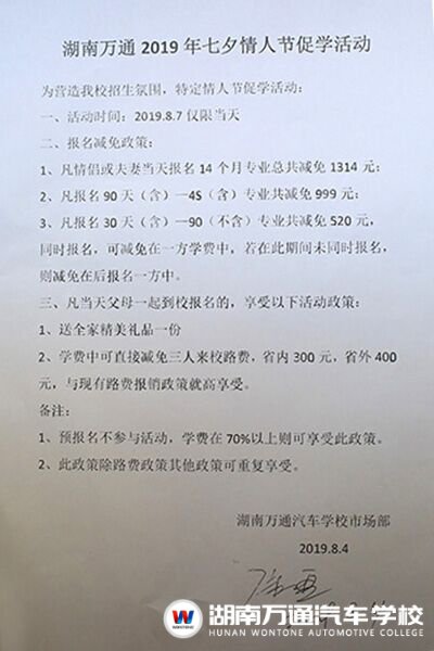 七夕將至,愛意充盈。這個七夕,我們要把愛和熱情奉獻給為夢想拼搏的你!為鼓勵各位學子勇敢追夢,湖南萬通汽車學校特舉行“以愛之名,約惠七夕”活動,凡8月7日(農(nóng)歷七月初七)報讀我校相關專業(yè),學費直減高至1314元。