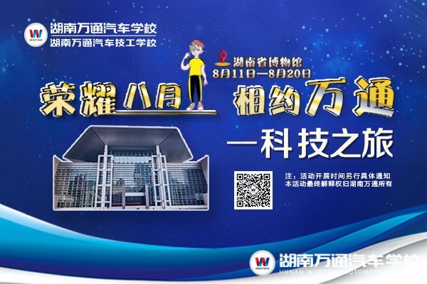 即日起至8月20日,來校參觀并報(bào)名我校14個(gè)月以上專業(yè)的學(xué)生,可獲“榮耀八月 相約萬通”科技之旅兌換券一張,由學(xué)校統(tǒng)一組織到湖南省博物館參觀體驗(yàn)。