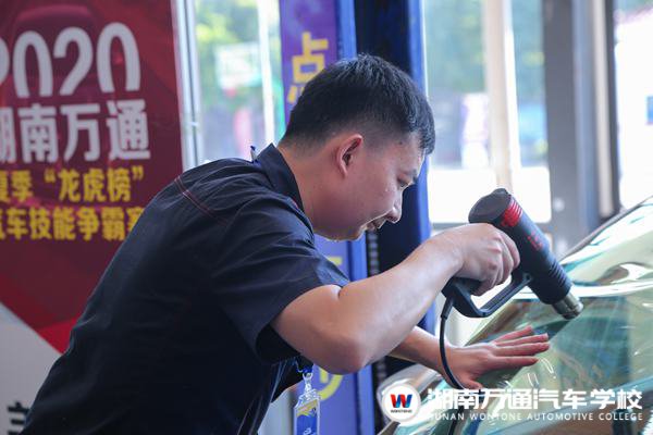 評(píng)比現(xiàn)場那張“貼膜精英大賽車檢施工單”,諸如:前風(fēng)擋玻璃折痕不超過一個(gè),所有貼膜后的玻璃不能有水泡,貼膜處玻璃不能有新創(chuàng)傷,車窗貼膜處膠條不能有新劃傷,側(cè)窗上端膜裁切平直等這些嚴(yán)格的操作細(xì)節(jié),更讓人增添對(duì)職業(yè)技能教育的嚴(yán)謹(jǐn)。作為汽車職業(yè)技能教育的老牌學(xué)校,湖南萬通始終堅(jiān)持“明德精技 知行合一”的辦學(xué)理念,在技能教學(xué)上嚴(yán)格要求,又不斷創(chuàng)新,以賽促學(xué),以賽促教,充分調(diào)動(dòng)師生在教學(xué)中的主動(dòng)積極性。