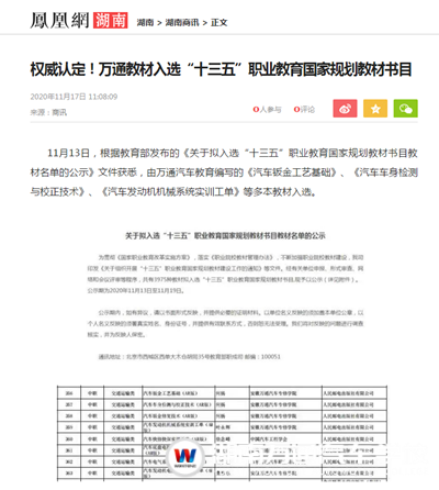11月13日,根據(jù)教育部發(fā)布的《關于擬入選“十三五”職業(yè)教育國家規(guī)劃教材書目教材名單的公示》文件獲悉,由萬通汽車教育編寫的《汽車鈑金工藝基礎》、《汽車車身檢測與校正技術》、《汽車發(fā)動機機械系統(tǒng)實訓工單》等多本教材入選。