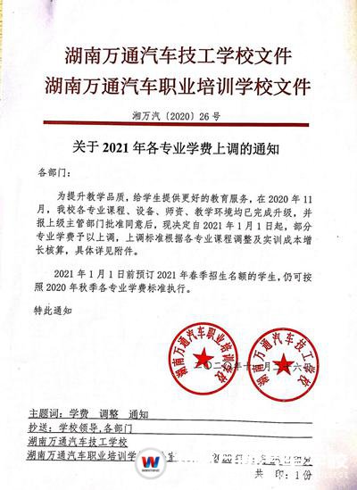為提升教學(xué)品質(zhì),給學(xué)生提供更好的教育服務(wù),在2020年11月,湖南萬通汽車學(xué)校各專業(yè)課程、設(shè)備、師資、教學(xué)環(huán)境均已完成升級,并報上級主管部門批準同意后,現(xiàn)決定自2021年1月1日起,部分專業(yè)學(xué)費予以上調(diào),上調(diào)標(biāo)準根據(jù)各專業(yè)課程調(diào)整及實訓(xùn)成本增長核算,具體詳詢湖南萬通汽車學(xué)校報名咨詢處。2021年1月1日前預(yù)訂2021年春季招生名額的學(xué)生,仍可按照2020年秋各專業(yè)學(xué)費標(biāo)準執(zhí)行。