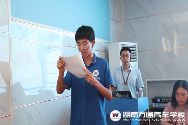 班長楊同學上臺發(fā)言,他總結了自己入校兩個月以來,從生活習慣到學習習慣,再到職業(yè)素養(yǎng)等方面的改變,并表示:在湖南萬通的校園生活里,會用最飽滿的熱情和積極的心態(tài)努力學習,希望三年之后滿載而歸!