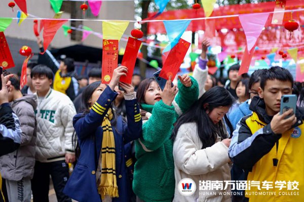 湖南萬通將校園文化與元宵佳節(jié)相融合,在校內(nèi)懸掛著一條條精美的燈籠彩帶,上面貼著各種謎語紙條。原來,同學(xué)們正在猜燈謎呀!
