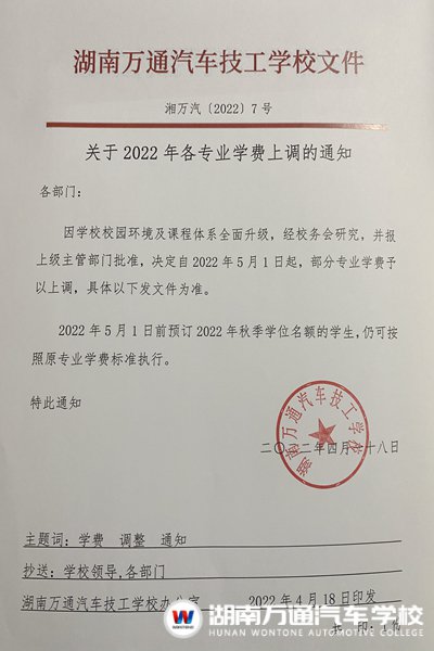 感謝大家一直以來的支持與厚愛,為了順應(yīng)當(dāng)下社會行業(yè)發(fā)展趨勢,給學(xué)生提供更優(yōu)質(zhì)的教育資源與高質(zhì)量的就業(yè)服務(wù),我校的校園環(huán)境及課程體系已進(jìn)行全面升級,經(jīng)校務(wù)會研究,并報上級主管部門批準(zhǔn),決定自2022年5月1日起,湖南萬通汽車技工學(xué)校將對部分專業(yè)學(xué)費予以上調(diào)。