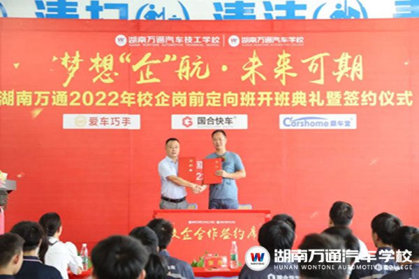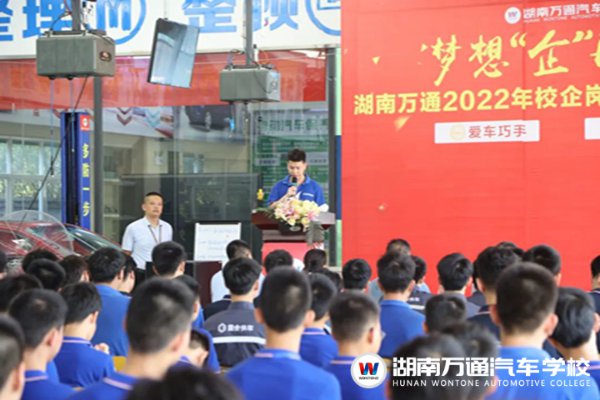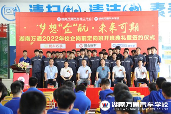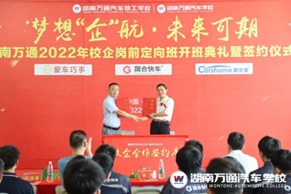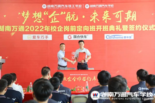 7月13日,湖南萬通召開2022年校企崗前定向班開班典禮及簽約儀式,出席本次活動的領(lǐng)導(dǎo)有:湖南萬通校長助理張助、愛巧手總經(jīng)理劉總、愛巧手負責人周總、鼎車堂副總王總、國合快車人事經(jīng)理何總、湖南萬通教務(wù)處張主任、學(xué)生處楊主任等。