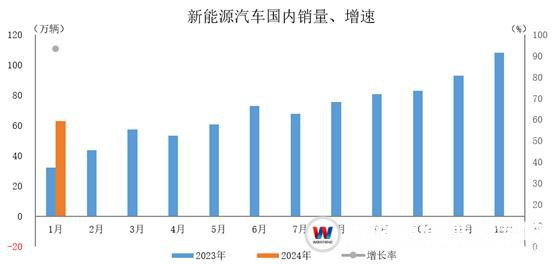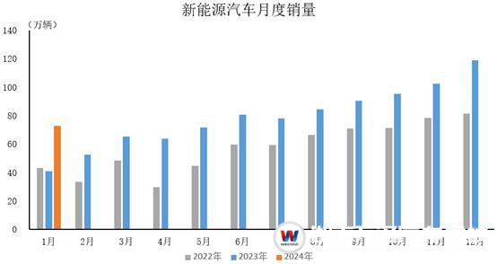 2024年1月,新能源汽車產(chǎn)銷分別完成78.7萬(wàn)輛和72.9萬(wàn)輛,環(huán)比分別下降32.9%和38.8%,同比分別增長(zhǎng)85.3%和78.8%。