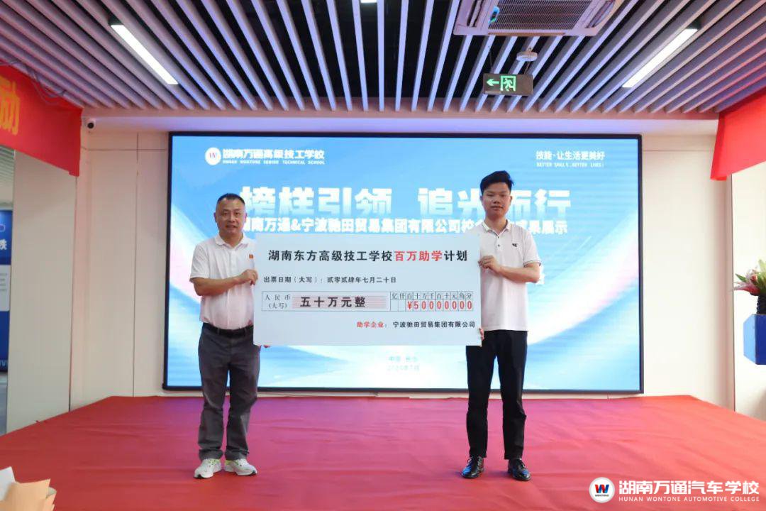 近年來,得益于優(yōu)秀人才的供給,湖南萬通已成為寧波馳田貿(mào)易集團(tuán)的校企合作重要伙伴,企業(yè)對我校的育人質(zhì)量與授課模式表示十分認(rèn)可。校友胡志銘代表企業(yè)宣布,寧波馳田貿(mào)易集團(tuán)有限公司捐贈50萬元企業(yè)助學(xué)金,用于湖南萬通高級技工學(xué)校專業(yè)發(fā)展建設(shè)。