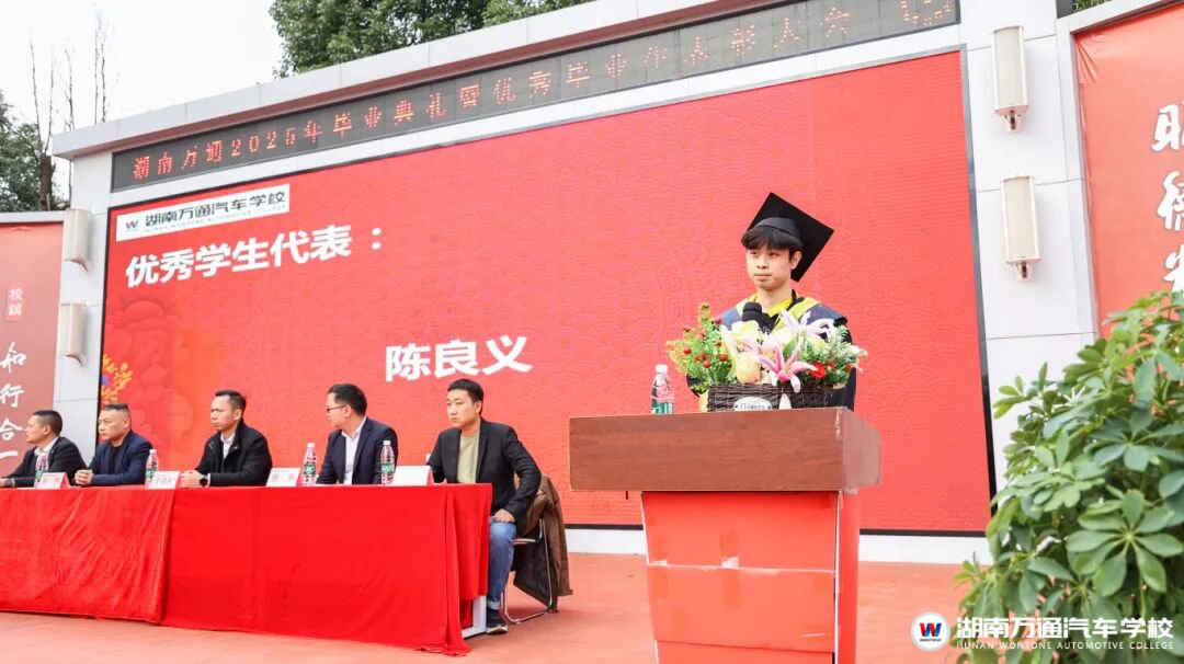 優(yōu)秀畢業(yè)生代表陳良義同學(xué)走上講臺(tái),他深情回顧了在校學(xué)習(xí)的難忘時(shí)光,表達(dá)了對(duì)母校、對(duì)老師的感激之情,并分享了在校學(xué)習(xí)的收獲與成長(zhǎng)。他堅(jiān)定地表示,將帶著湖南萬(wàn)通所賦予的專(zhuān)業(yè)技能與工匠精神,勇敢奔赴下一場(chǎng)山海,引起了在場(chǎng)畢業(yè)生的廣泛共鳴。